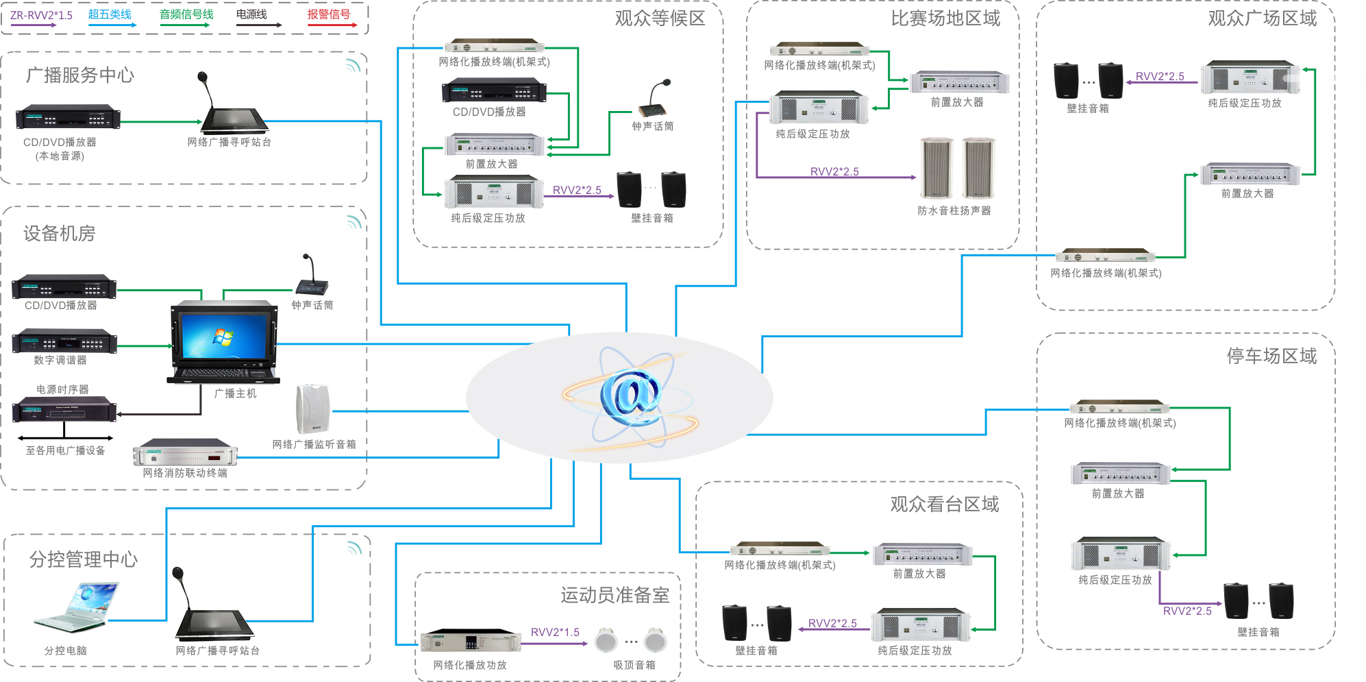 體育場館公共廣播系統包括日常的背景音樂播放,各項背景音樂廣播任務分區播放,全天候或定時段播放,無人值守;各項實時業務廣播的播報; 消防廣播緊急強插等,要求廣播系統具備穩定性,綜合性,智能化,多樣化等特點。