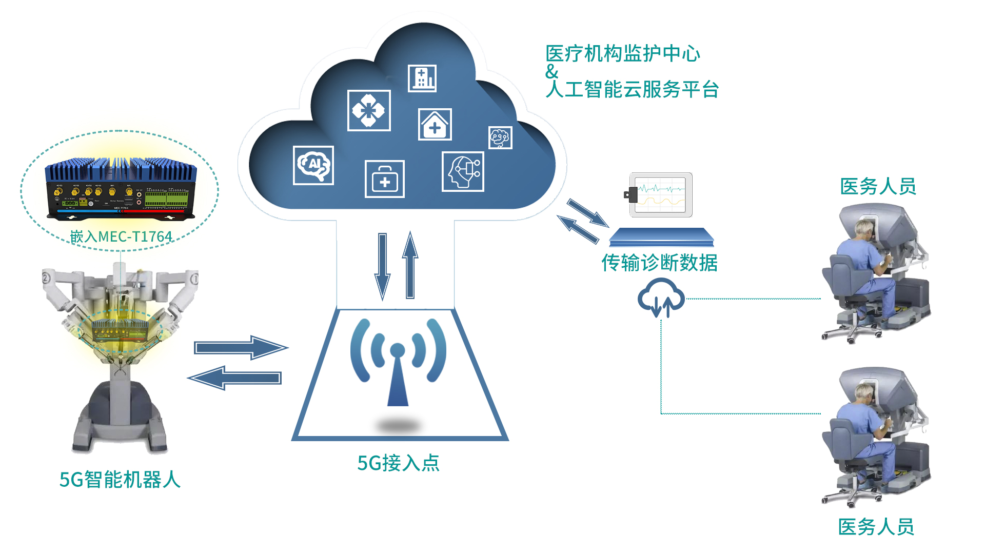 低延遲、高可靠度、高帶寬移動網絡將允許我們引入云計算和人工智能技術。在醫療領域,智能醫療機器人是人工智能技術應用的重要硬件平臺,表現出深度學習、人機協作、自主操控的應用發展特征,將成為我國醫療服務高質量發展的重要推手。